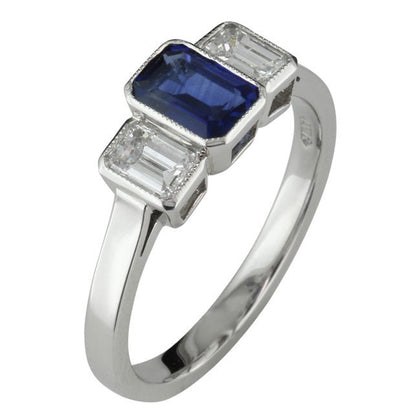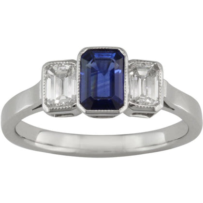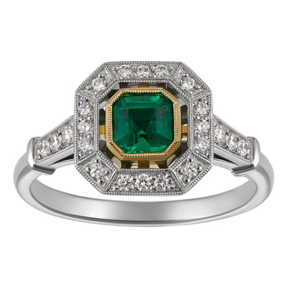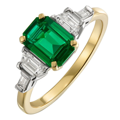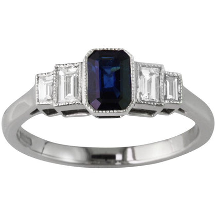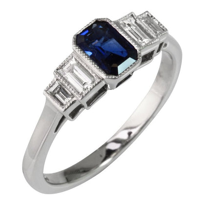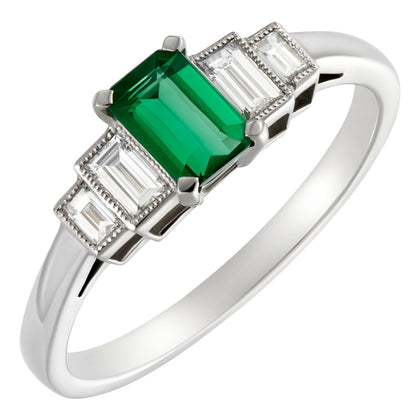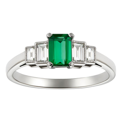 Art Deco Engagement Ring in Platinum with Emerald Cut Centre Natural Diamond, Made in London, UK