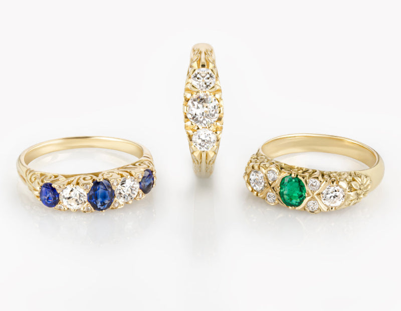 Romanticism inspired many areas of life during the Victorian era. Romantic jewellery included antique engagement rings such as love token rings which spelled out the words ‘Regard’ or ‘Dearest’ in coloured stones and diamonds. The Victorian period also included the Language of Flowers and the 19th century naturalistic movement, with rings delicately engraved with flowers and rich with coloured gemstones.