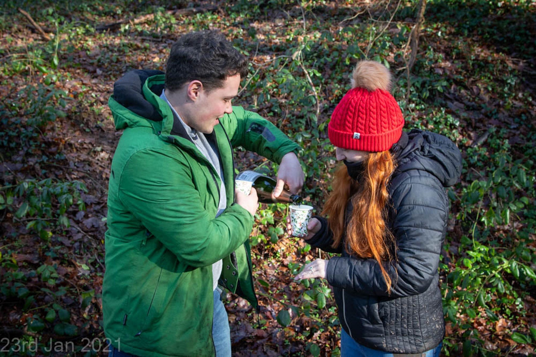 We bought our puppy Loki (a Sprollie – Springer Spaniel x Collie) in July 2020 and ever since have fallen in love with our local woods in Hanham, Bristol. We were decorating the kitchen on Saturday 23rd January when Ryan said “let’s take the dog out in the woods today”. We wandered into the woods and after about half an hour, we bumped into my parents. Dad had a camera in his hand as he is a keen photographer. I didn’t even have time to think, I turned to see Ryan on one knee in the middle of the woods holding this beautiful green box with the most stunning ring. The ring, the surprise, the woods, and the mud-stained knee is something I will NEVER EVER forget and will cherish forever. After popping a bottle of champagne my parents had brought along and raising a paper cup (socially distanced), we were back trekking up the hill of the woods home for lots of Zoom celebrations! We are still very much enjoying this engagement bubble and look forward to celebrating in person with our family and friends.