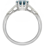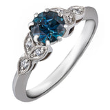 This vintage style teal sapphire engagement ring is made in a floral design. The desirable blue teal sapphire sits between six diamond-set leaves. The ring and exquisite knife edge band have been created in high specification platinum 950.