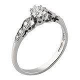 Three further round diamonds are set on either side of the main diamond. These diamonds are held in a graceful fluted setting and edged with a trail of fine beading.