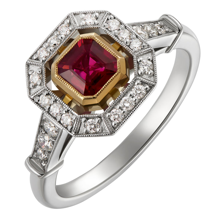 This stunning Art Deco style ruby and diamond cluster ring features a square octagonal ruby at the centre, surrounded by 16 diamonds. A further three diamonds are set on each side of the band. The diamonds are edged with vintage style millegrain.