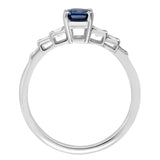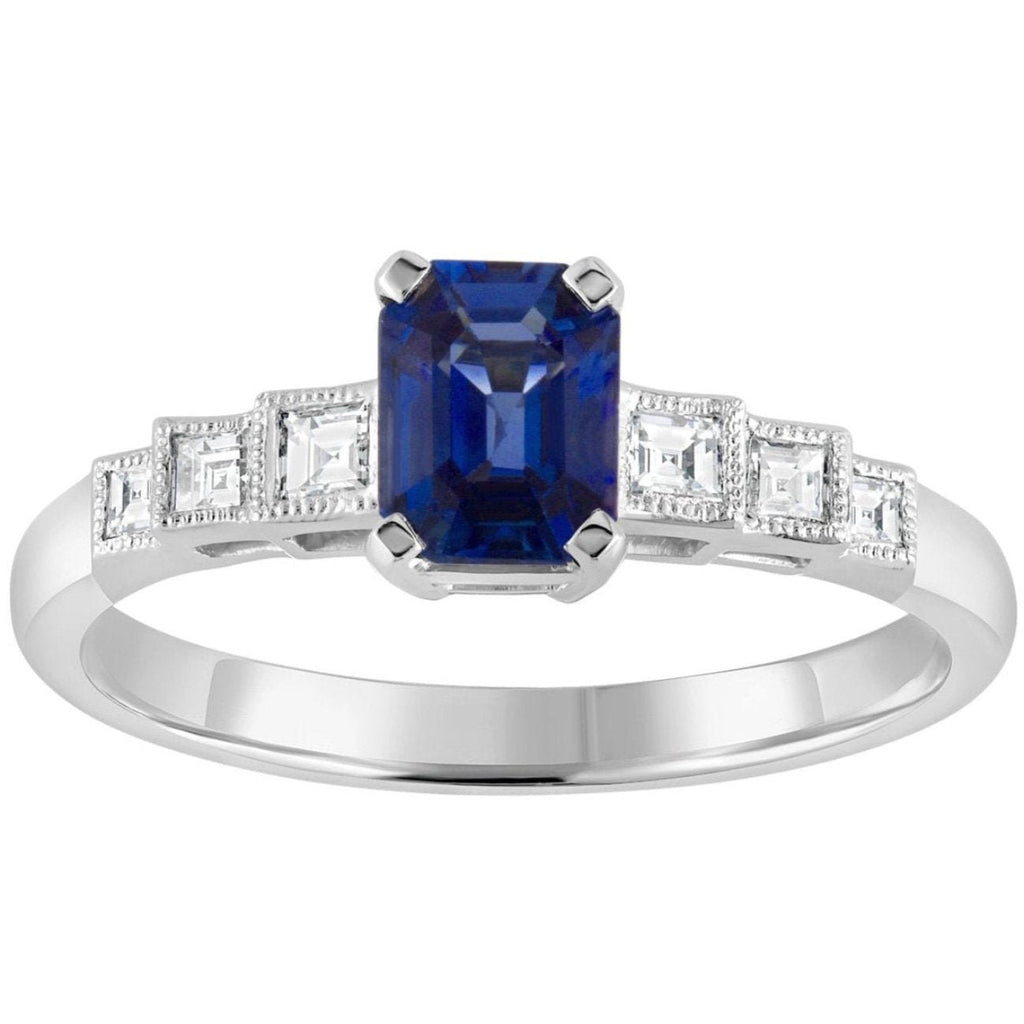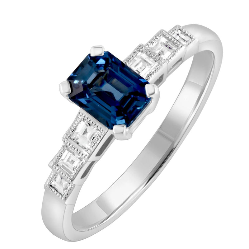 The emerald-cut blue sapphire is held in a four-claw setting, and the diamonds have millegrain beads on the edges to match the vintage style.