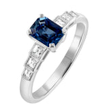 Based on an original Art Deco design, this sapphire engagement ring has unique stepped shoulders containing six princess-cut diamonds.