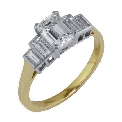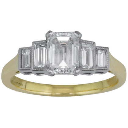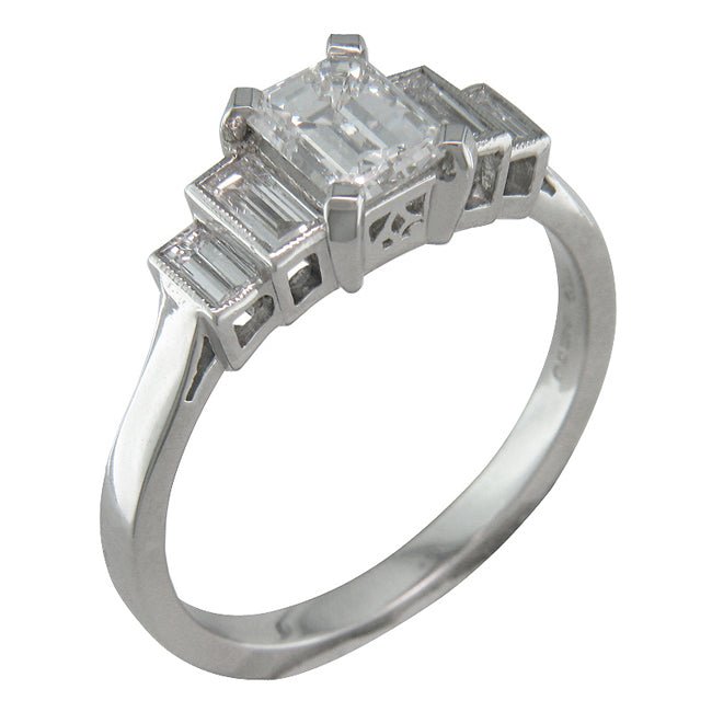 The centre GIA graded emerald cut diamond is held in place within an ornate collet by four flat claws. The sides of the centre collet are cut out in a lattice like design, in keeping with the Art Deco design of the ring. Two baguette cut diamonds, on either side of the main gemstone, are set in rectangular millegrain collets. These lead to a flat band with softly rounded edges.