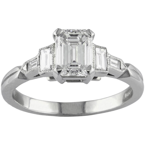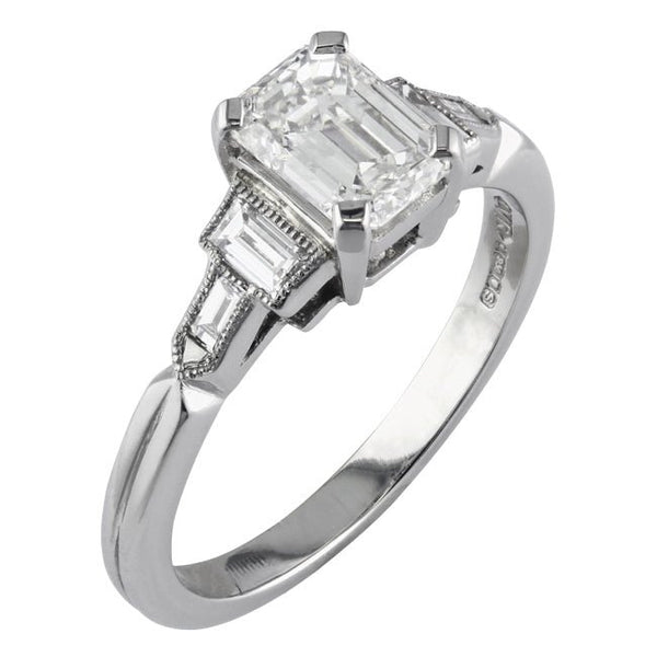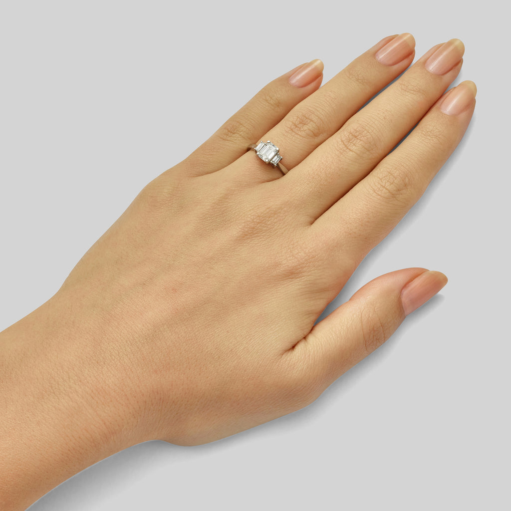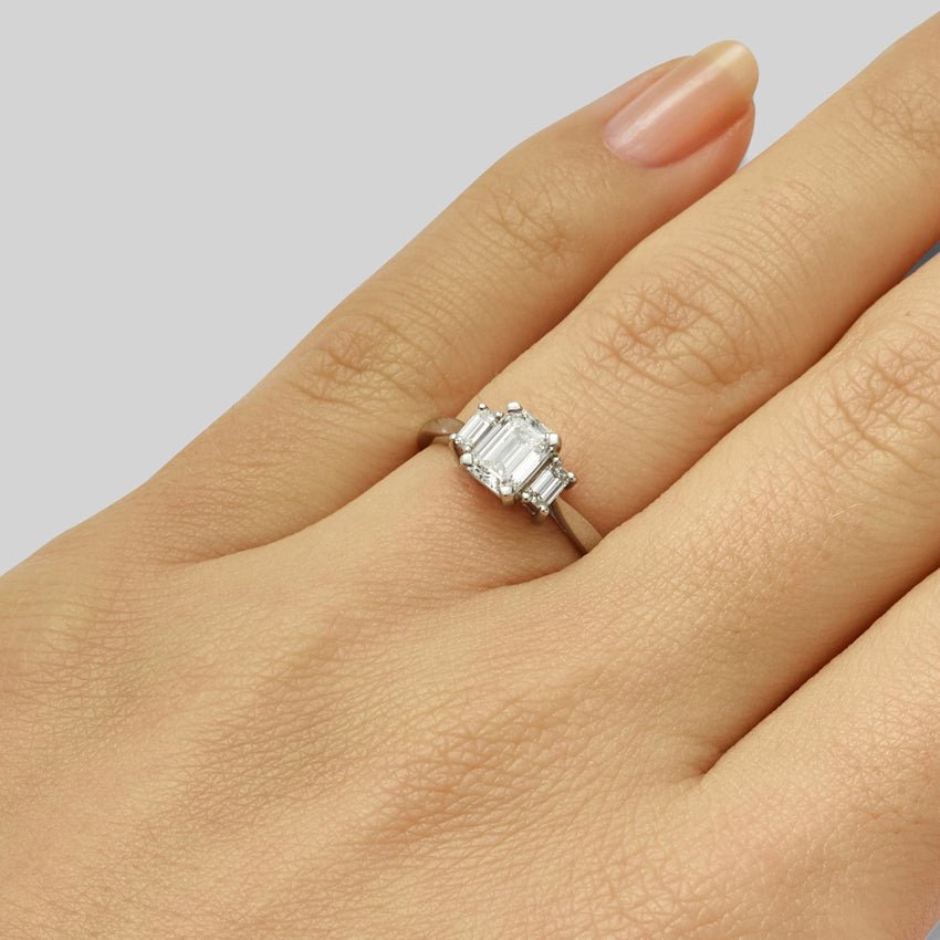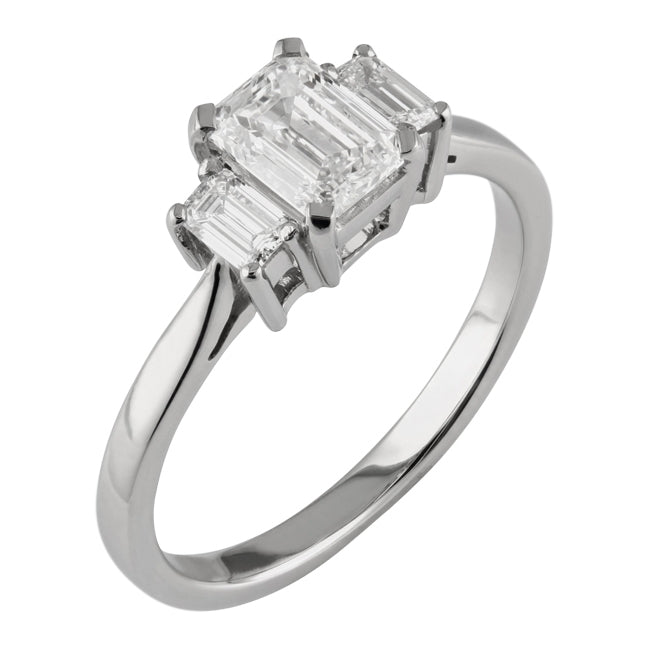 This three stone emerald-cut engagement ring in platinum has a trio of high-quality diamonds. The central GIA graded 0.80 carat diamond is enhanced by two further gemstones. This beautiful ring has a split band that gently tapers upwards towards the diamonds.