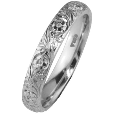 This flower wedding ring in 18ct white gold is hand engraved with the camellia japonica design in a 3 mm width.