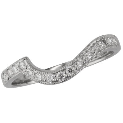 Our fitted diamond wedding ring was especially created to fit with our swirl engagement ring from our collection. The round brilliant cut diamonds are framed by a milligrain edge in the traditional vintage style. This ring can be made in your choice of metal.