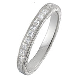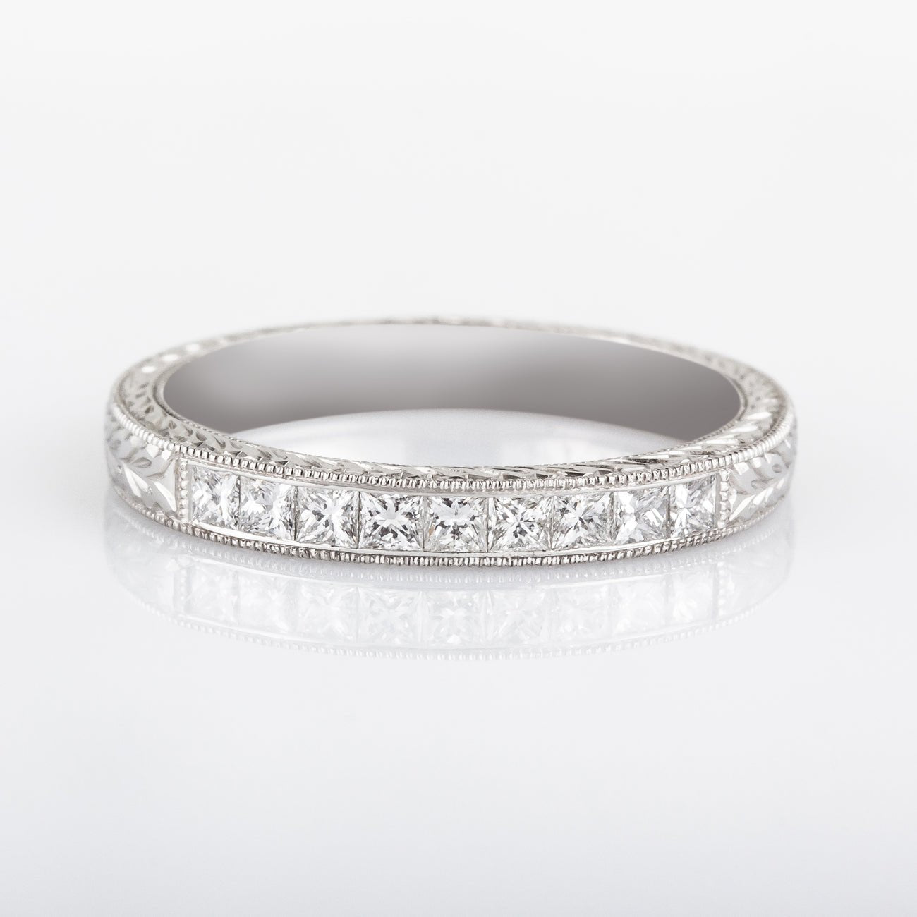 This dazzling 3mm wedding ring for women features nine princess-cut diamonds securely held in a laurel-engraved platinum 950 band. The band features a delicate millegrain edge which further enhances the richness of the vintage style design. Ideal for those seeking an extra touch of elegance for their special day.