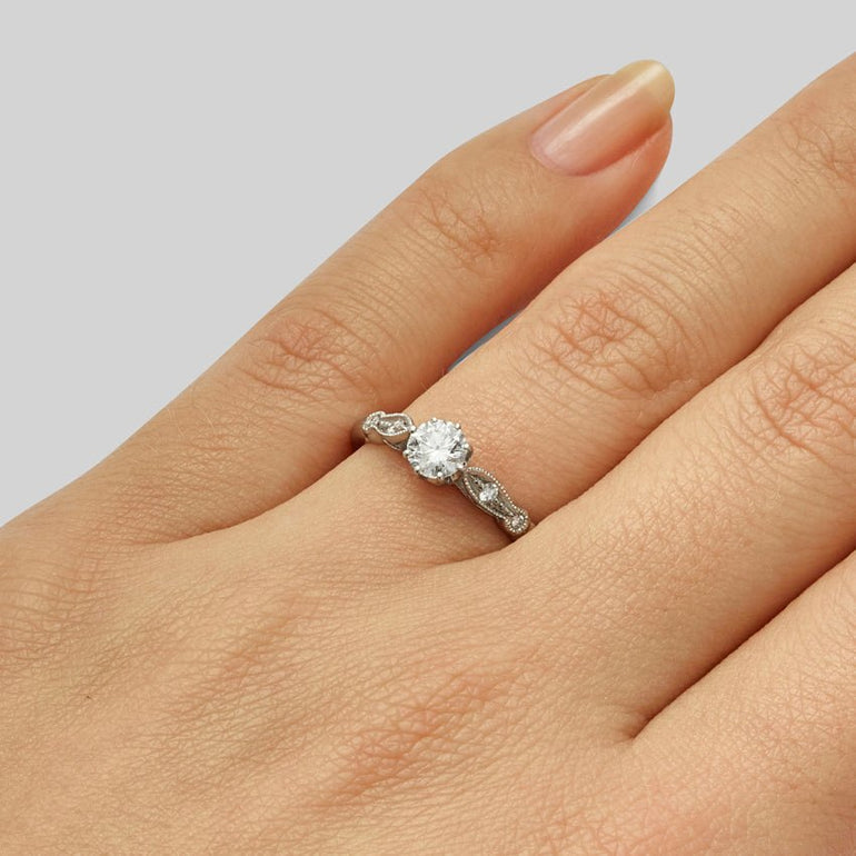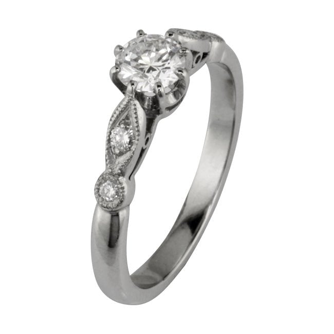 Diamonds in the curved and shaped shoulders help to emphasis the central round brilliant cut diamond in this Edwardian style ring. A further round diamond is set in a millegrained circle on each shoulder, which adds to the refined elegance of this ring.