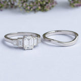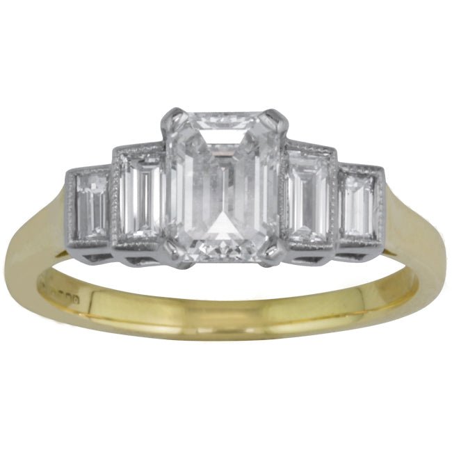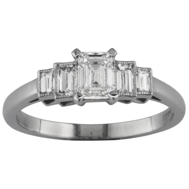 The centre GIA graded emerald cut diamond is held in place within an ornate collet by four flat claws. The sides of the centre collet are cut out in a lattice like design, in keeping with the Art Deco design of the ring. Two baguette cut diamonds, on either side of the main gemstone, are set in rectangular millegrain collets. These lead to a flat band with softly rounded edges.