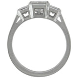 This striking Art Deco style three stone engagement ring is set with emerald cut diamonds. The diamonds are rub-over set.