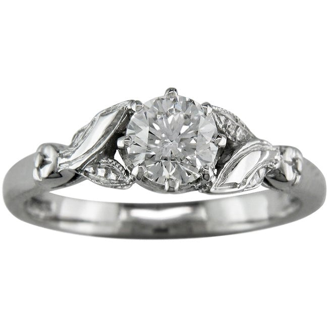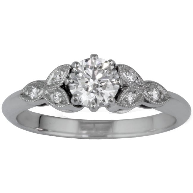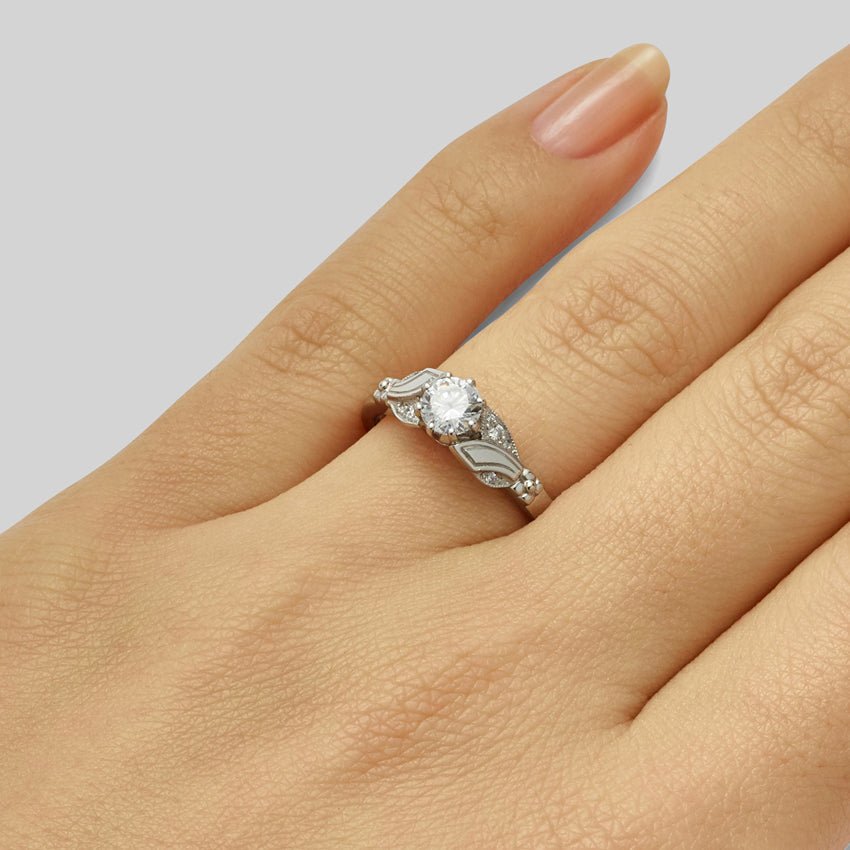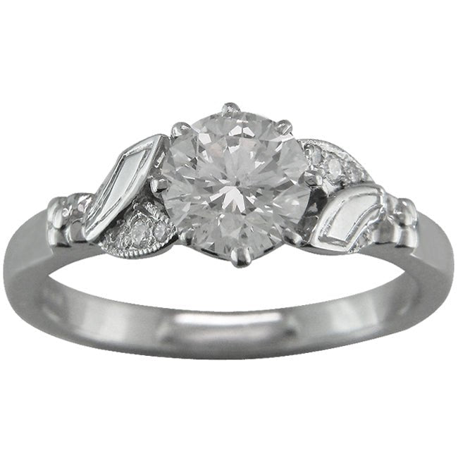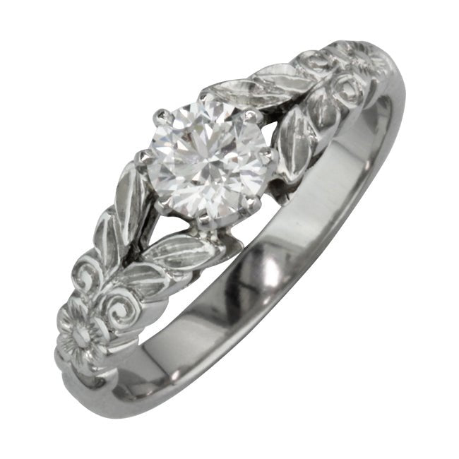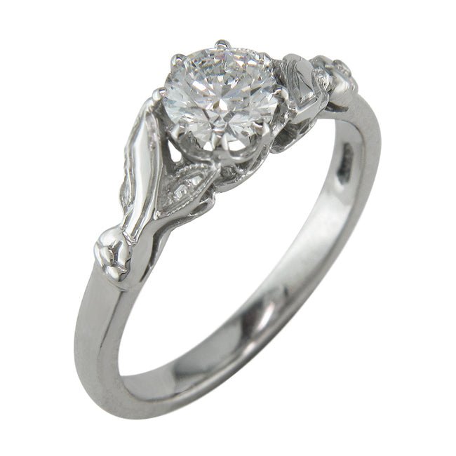 This unique engagement ring setting was inspired by the floral motifs of the Edwardian era. The central gemstone is held by two pairs of leaves. One leaf in each pair is set with diamonds weighing a total of 0.05 carat giving a detailed finish and interest to the leaves.