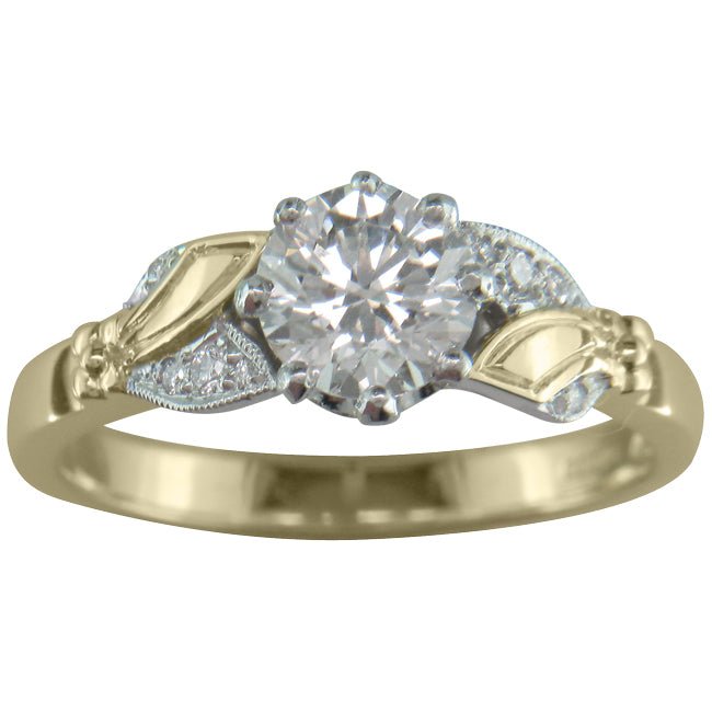 The band is made of yellow gold and platinum leaves, leading to a yellow gold flower.