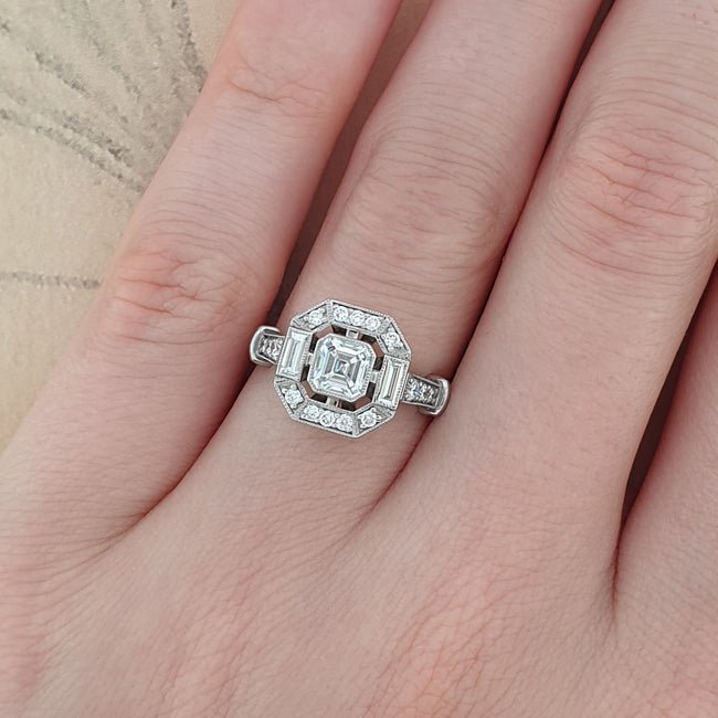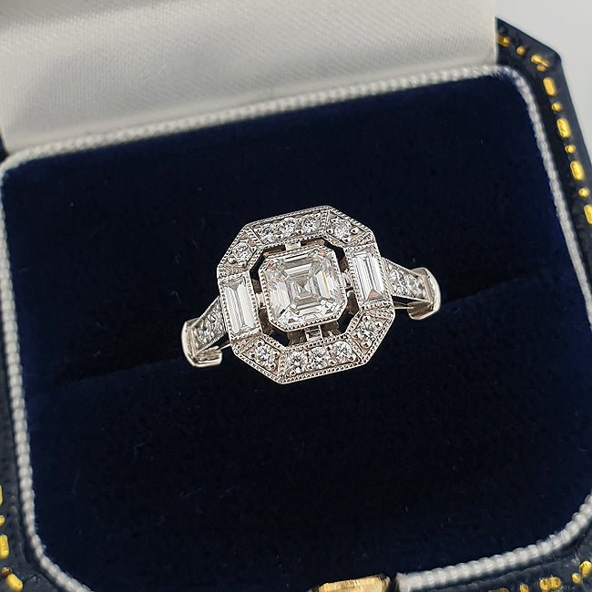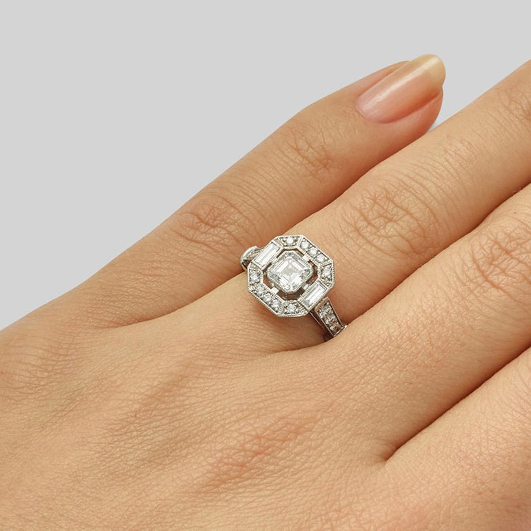 An Asscher cut diamond is in the centre of this striking octagonal shape cluster ring. Two baguette-cut diamonds have been placed on either side of the main diamond, with a further 16 round diamonds surrounding and cascading down the sides of this Art Deco style engagement ring.