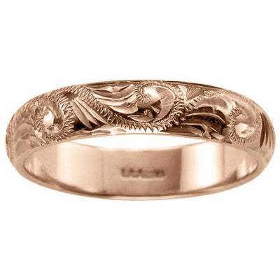 This 18ct rose gold ring is engraved with the paisley pattern, a curved design that looks similar to a comma. The 4mm width is a deep D-shape with a dome shape profile.