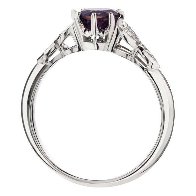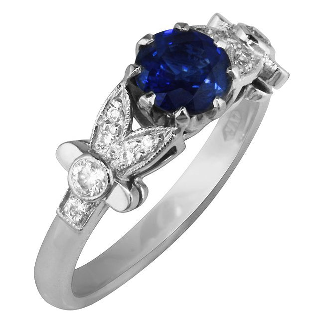 The sapphire is set in a beautiful platinum ring with a floral design. The leaf motifs are set with six diamonds.