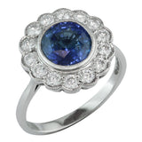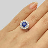 This blue sapphire cluster ring in platinum is set with a 2.02-carat round sapphire, surrounded by 14 round diamonds. The Royal blue sapphire is bright and lively.