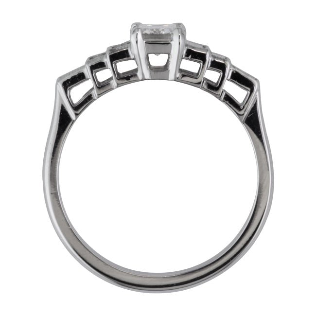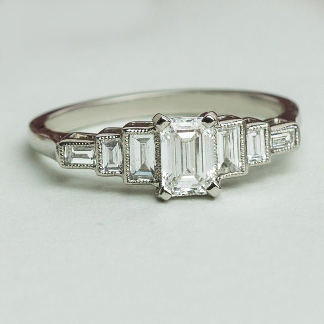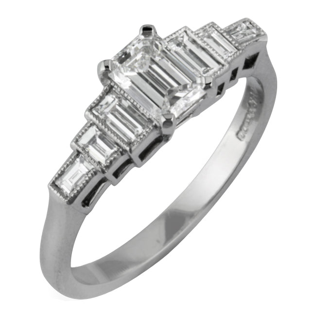 This strong Art Deco engagement ring design is characteristically rectangular and geometric in style. The centre GIA graded emerald-cut diamond is held by four flat claws with rounded edges.