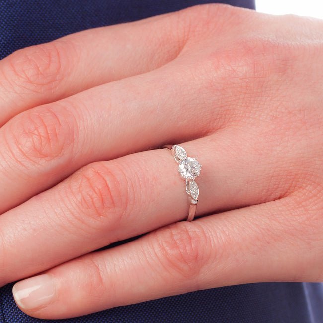 The side round diamonds are held within marquise-shaped shoulders, giving the piece an elegant and flowing appearance. The hand-applied millegrain around the edges completes the design.