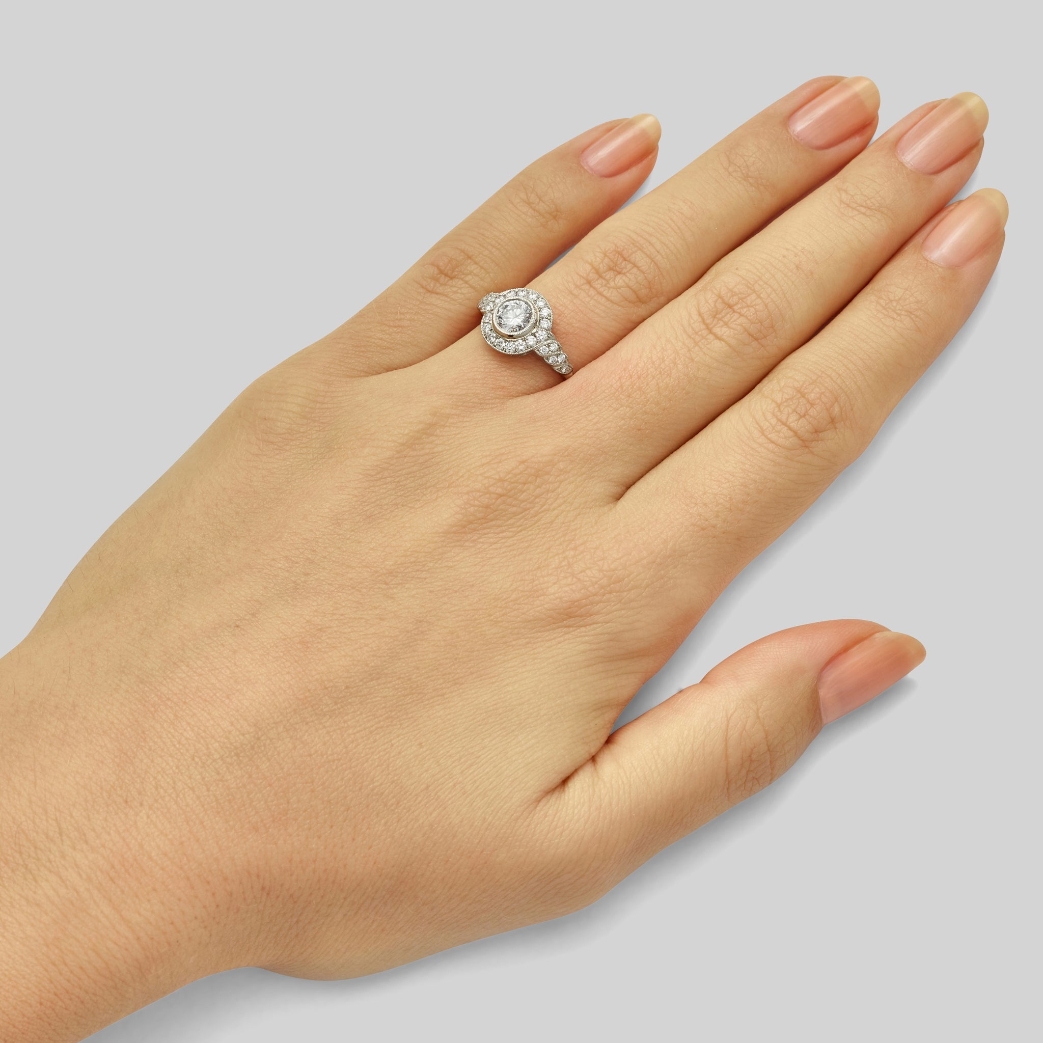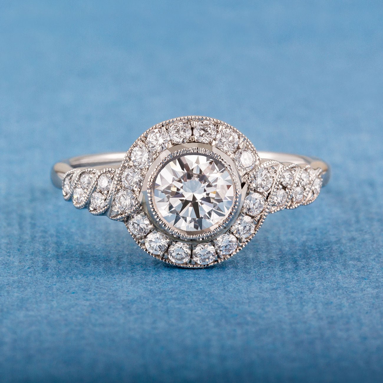 This Edwardian style diamond cluster ring has unusual diamond-set spiral shoulders. The central diamond is surrounded by a halo of 16 round diamonds, with a further five diamonds on each shoulder.
