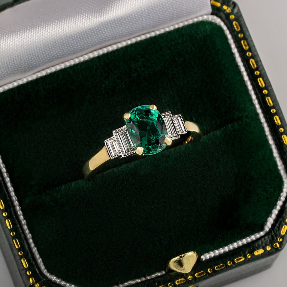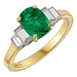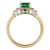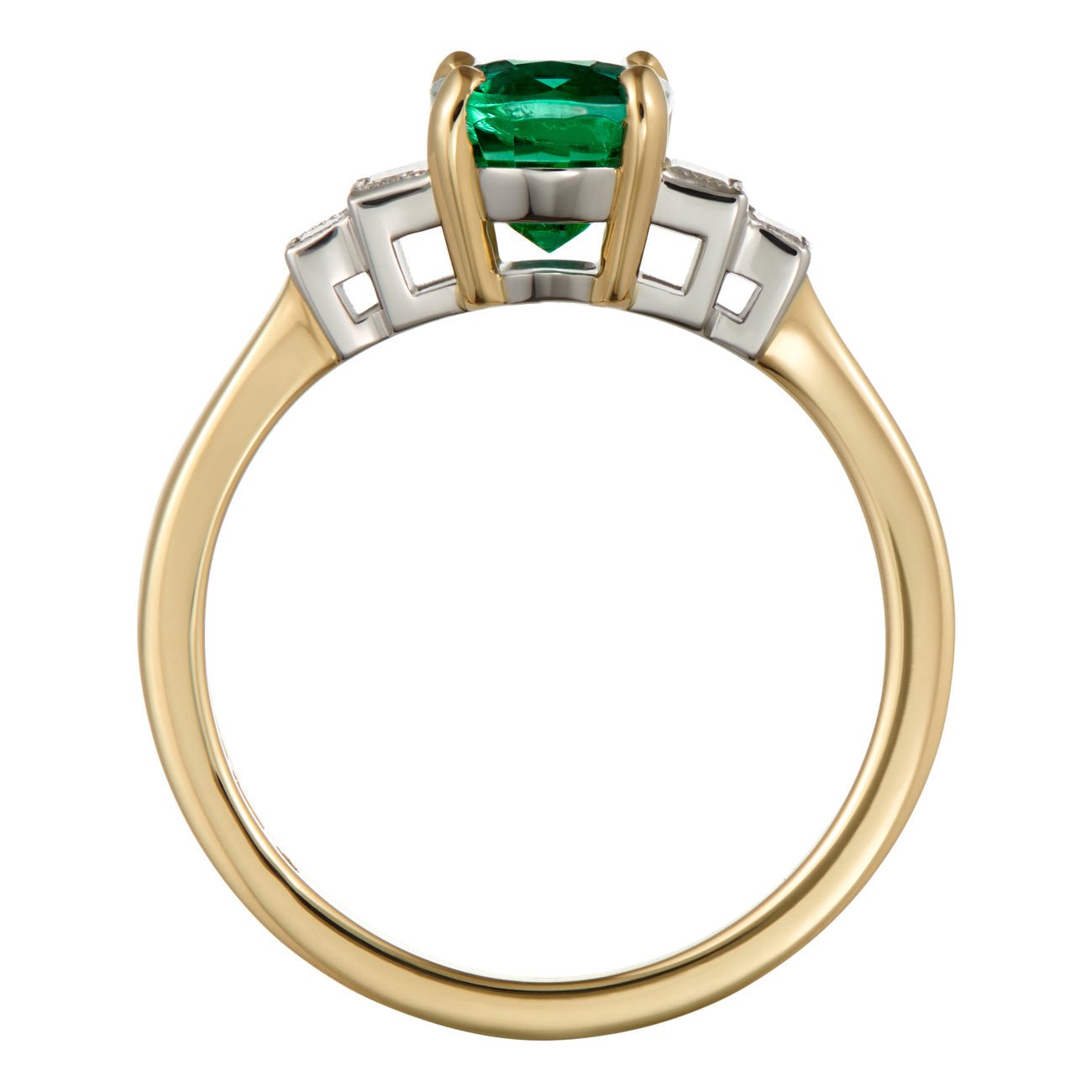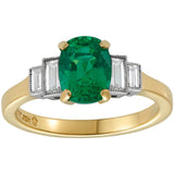 This cushion-cut emerald ring features an emerald with two baguette-cut diamonds on either side. The diamonds are set in platinum to showcase the F/G colour and VS clarity. The 18ct yellow gold four claw setting and band suits the warm green colour of the emerald.