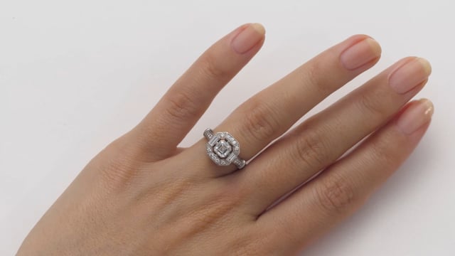 An Asscher cut diamond is in the centre of this striking octagonal shape cluster ring. Two baguette-cut diamonds have been placed on either side of the main diamond, with a further 16 round diamonds surrounding and cascading down the sides of this Art Deco style engagement ring.