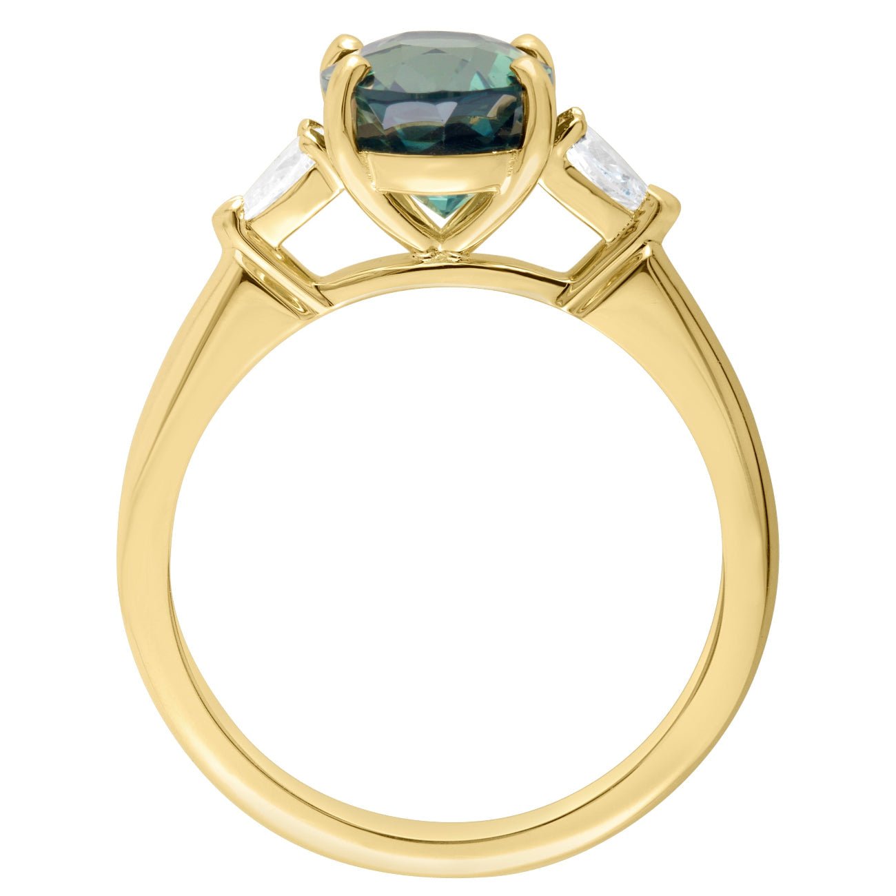 Shop our oval green sapphire engagement ring with pear side diamonds. At the heart of the design is a large oval green sapphire, an outstanding gemstone admired for its depth of colour. This trilogy ring is completed with a pear-shaped natural diamond on each shoulder, carefully selected to complement the green sapphire. The 18ct yellow gold band captures and reflects light with every movement when worn.