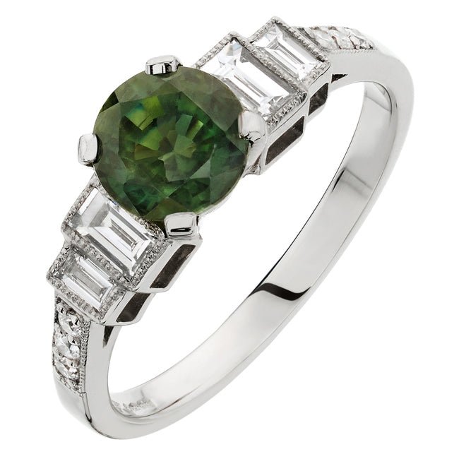 This unusual green sapphire and diamond ring is made in the Art Deco style. The round green sapphire is held in a four-claw setting.