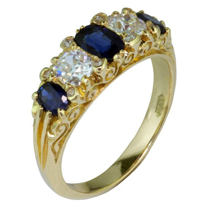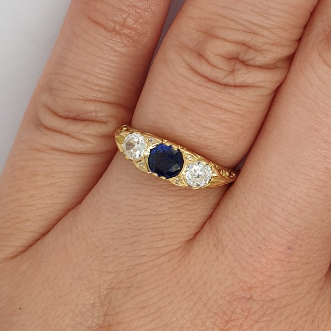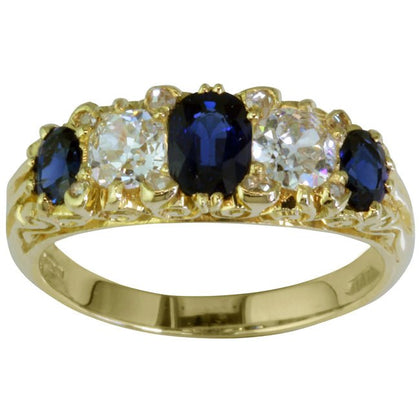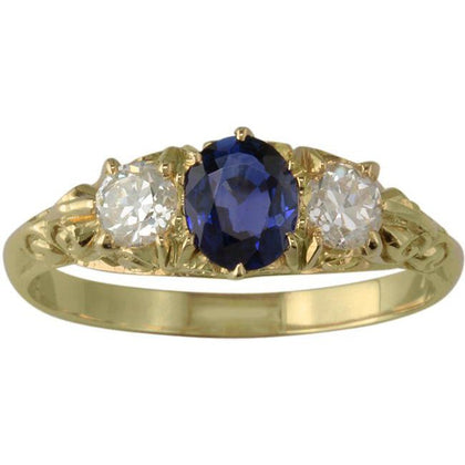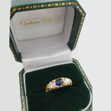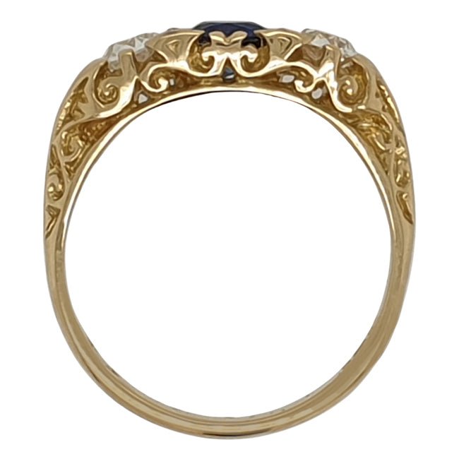 This sapphire and diamond ring is set with a centre blue sapphire with an old-cut diamond on either side. The 18ct yellow gold ring has four diamond points set between the sapphire and larger diamonds.