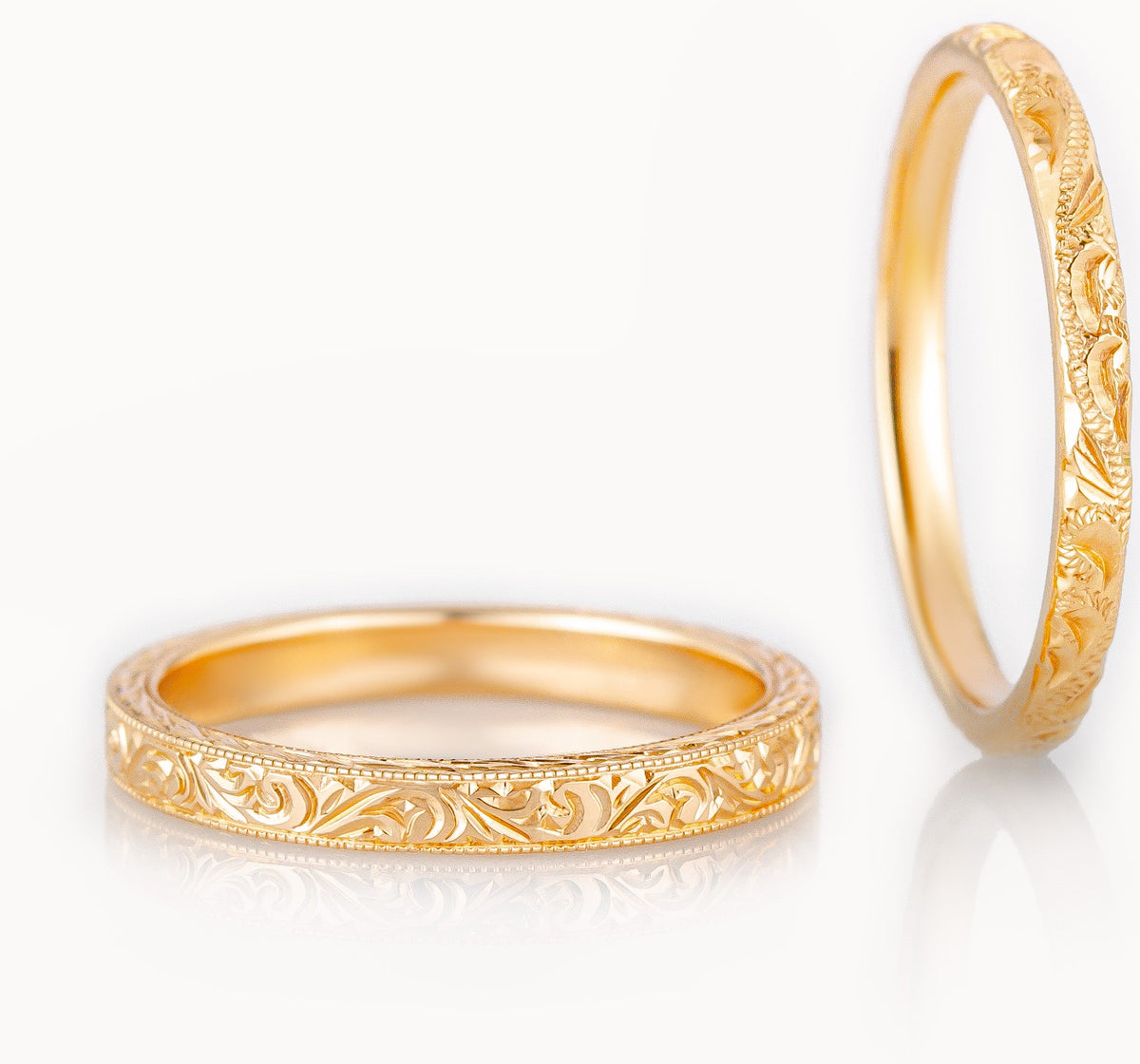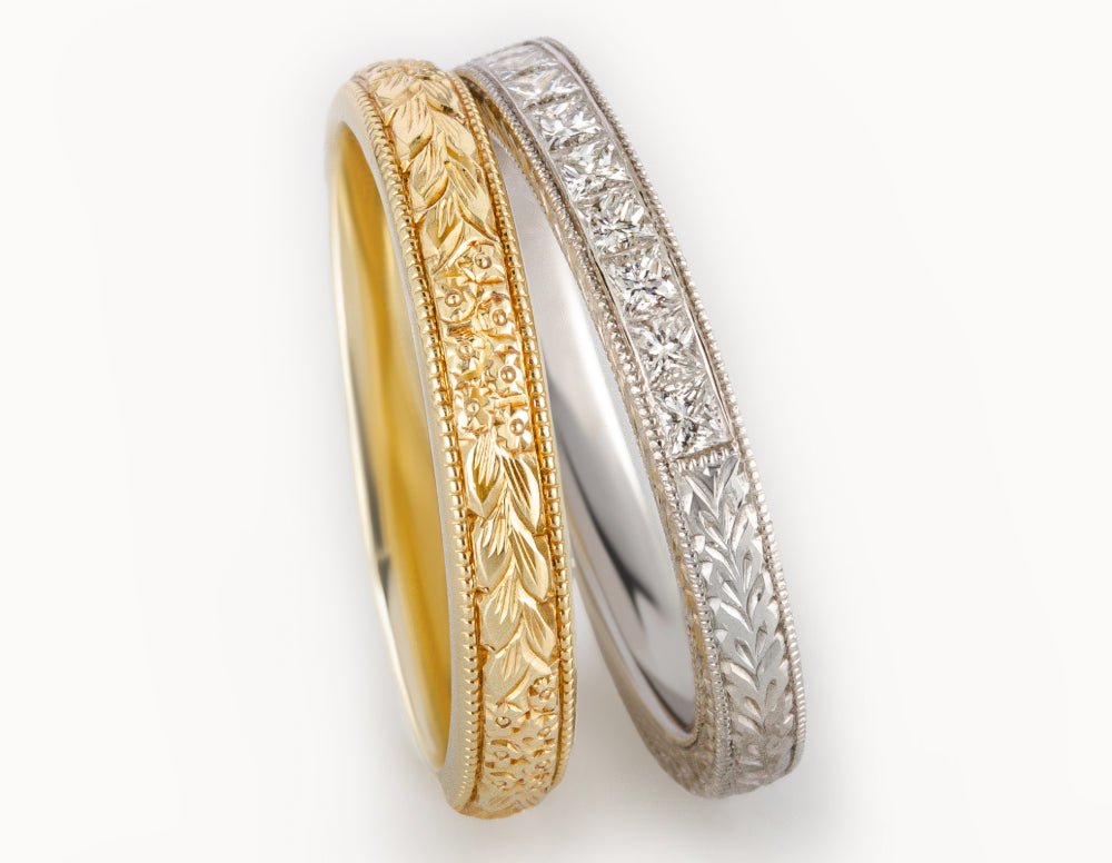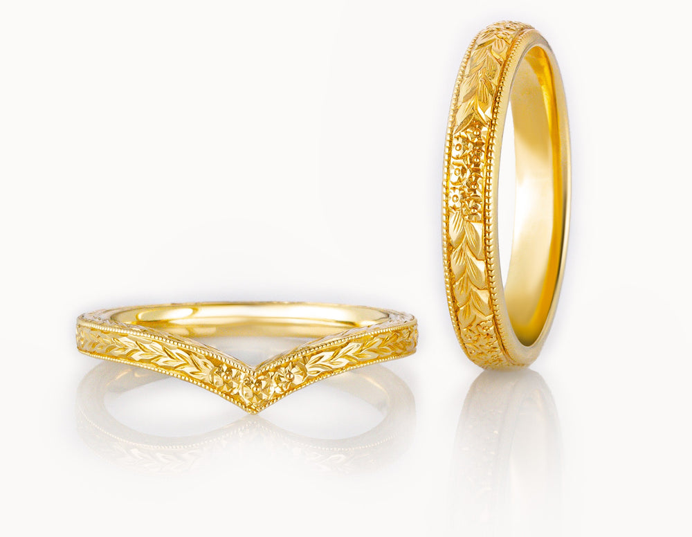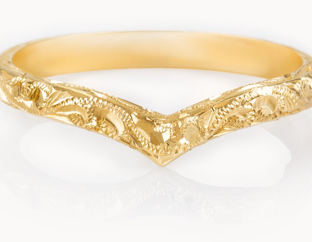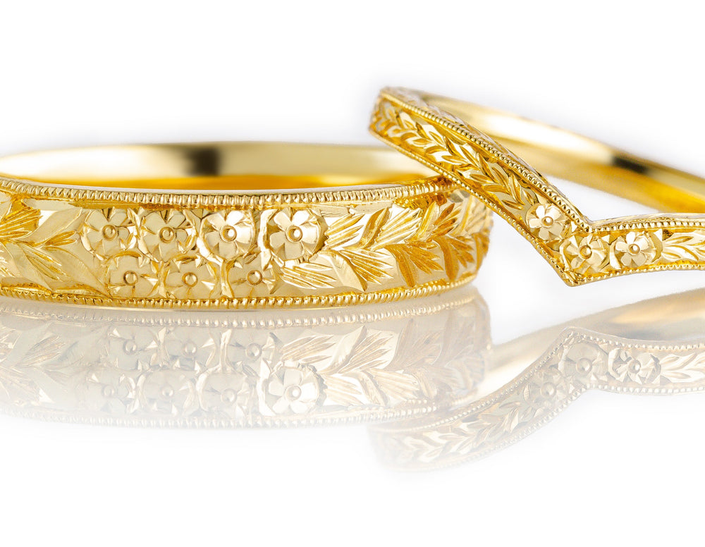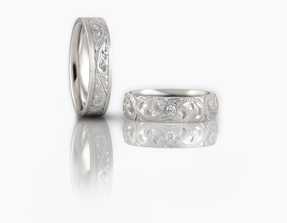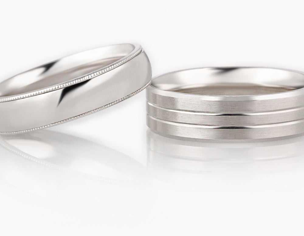 Shop our collection of 18-carat rose gold wedding rings for him. Rose gold has a warm hue, making it a popular metal for male wedding rings due to its unusual tone. As well as offering plain, engraved and unique rose gold men's wedding rings, you can select the width to suit you, from a slim man's ring to the popular 4mm, 5mm and 6mm widths and broader. All wedding rings are individually made to order in the United Kingdom.