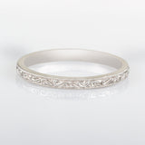 This hand engraved wedding ring is 2mm wide and made in 18ct white gold. The vintage style scroll pattern is edged with small white gold millegrain beads.