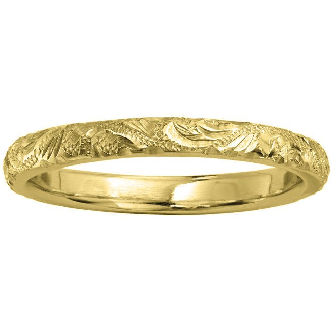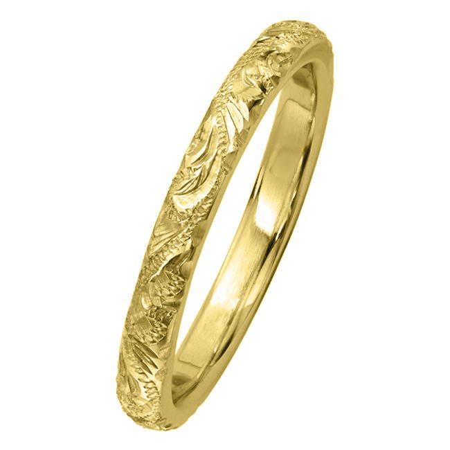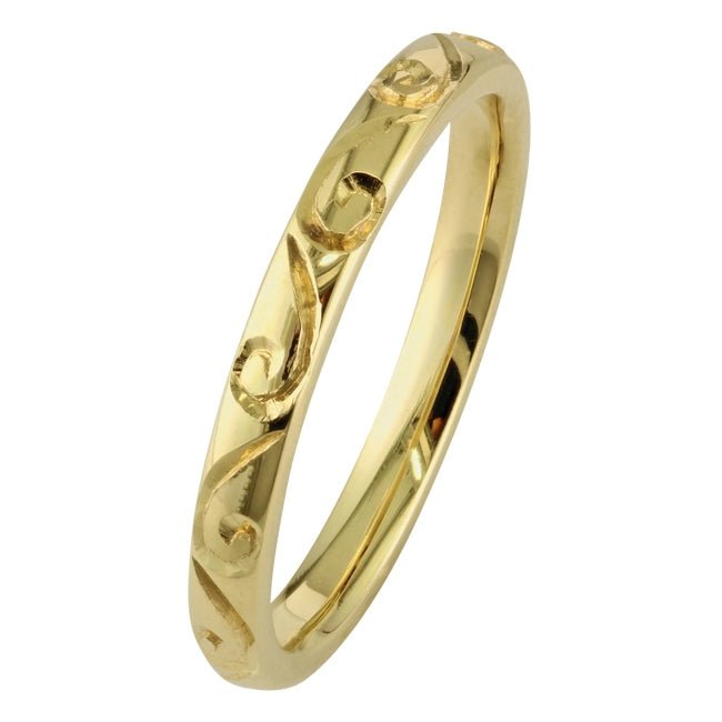This 2.5mm wide yellow gold wedding ring in a court shape is hand engraved in an elegant pattern. This creates a lovely bridal set with our Victorian style engagement rings or looks great alongside modern engagement rings that have a court shape (rounded on the outside and flat on the inside of the ring).
