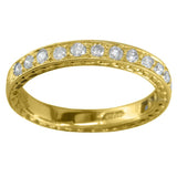 A vintage style laurel patterned diamond wedding ring with 15 round brilliant cut diamonds in 18 carat yellow gold.