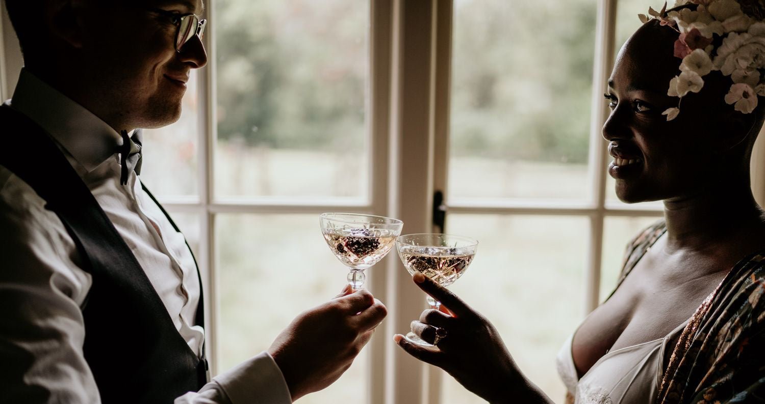 Bride and groom toasting glasses for glasshouse wedding ceremony
