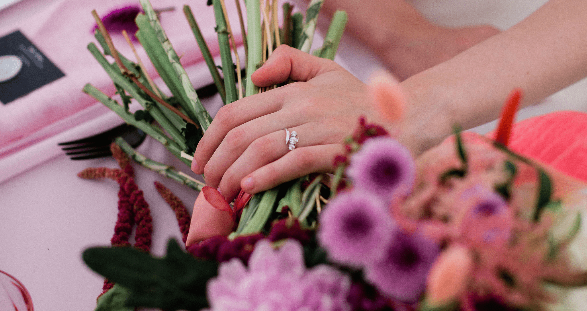 Think pink! This wedding shoot features pink hair, pink flowers and our gorgeous pink sapphire and diamond ring.