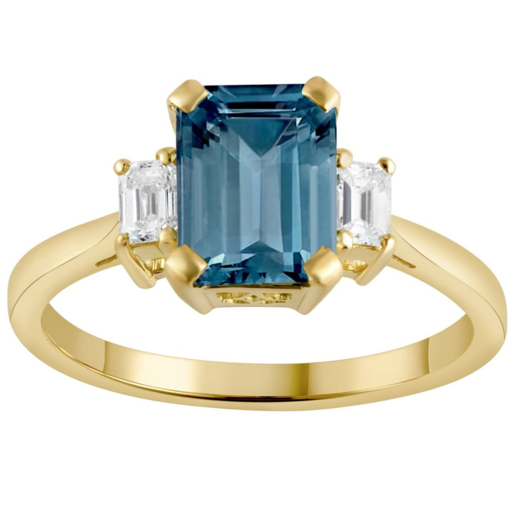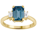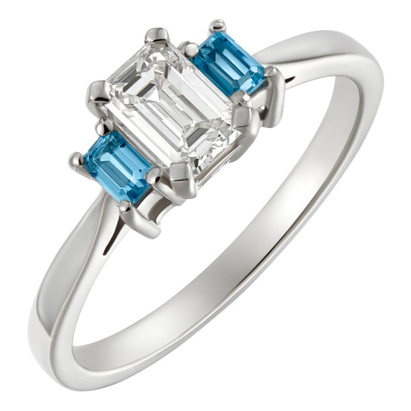 Our aquamarine and diamond trilogy ring features an emerald-cut light blue aquamarine in the centre, with an emerald-cut diamond on either side.