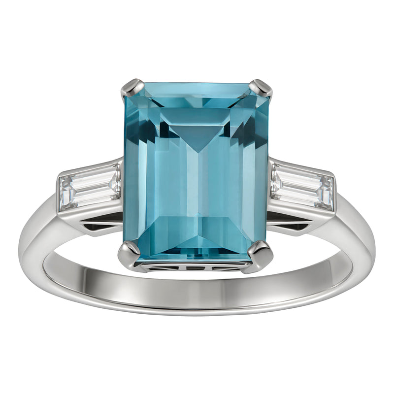 This impressive ring is set with an aquamarine weighing 3.12 carat. A baguette cut diamond on each shoulder highlights the central gemstone. The ring is made in high quality platinum 950.
