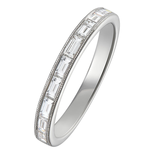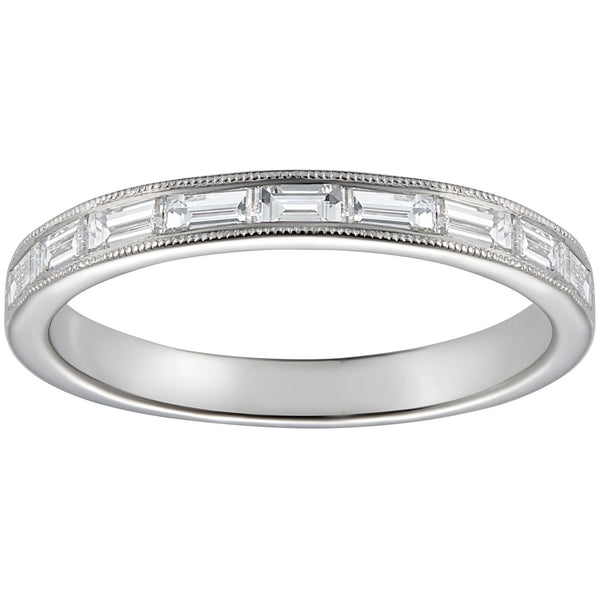 This baguette cut diamond half eternity ring is set with seven carefully matched diamonds weighing one-carat in total. The 3mm band is made in platinum 950.