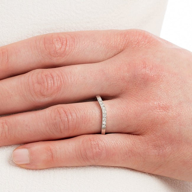 Curved diamond and platinum wedding band on finger