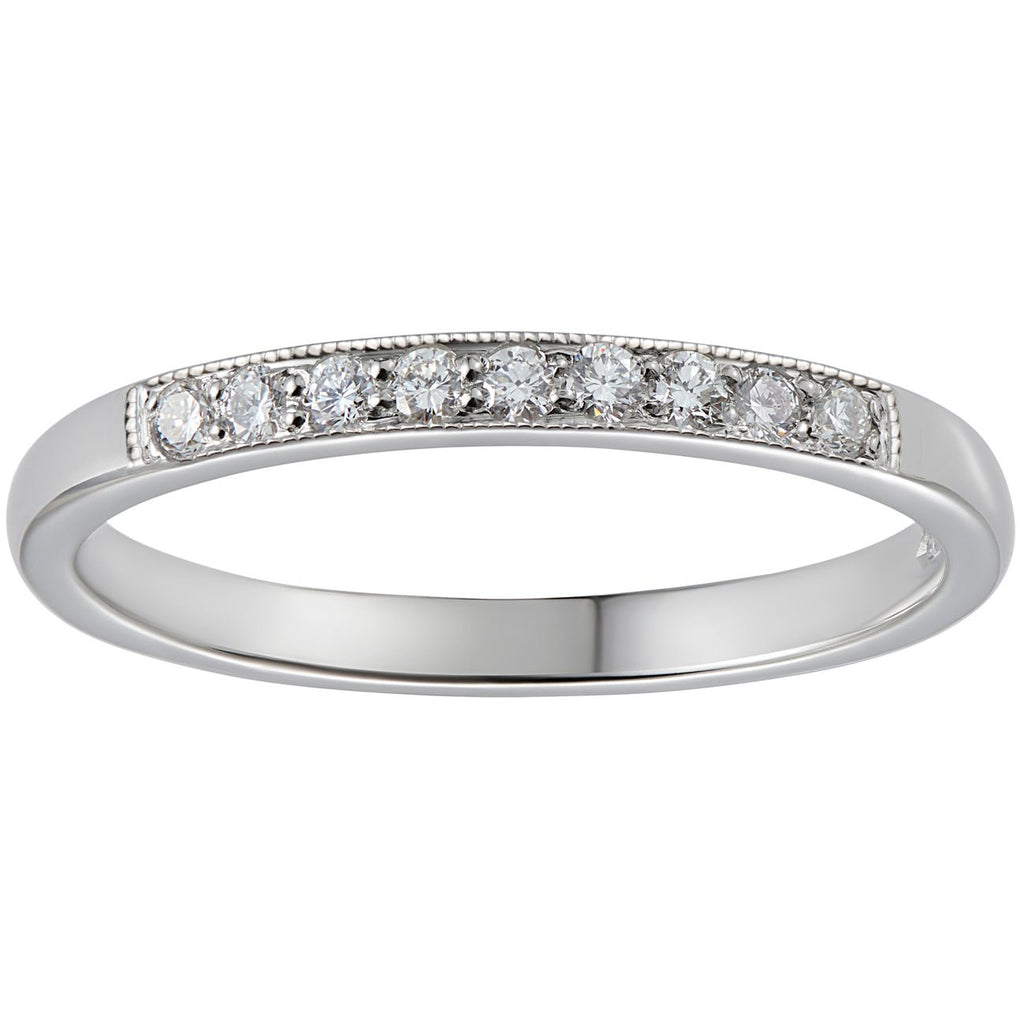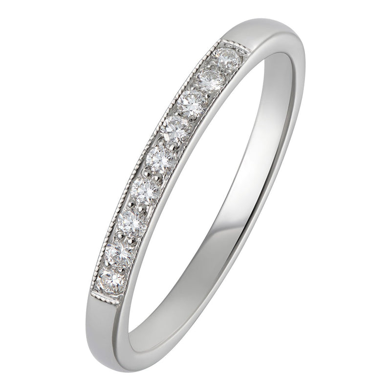 This 2mm women's wedding ring in 18ct white gold is pave set with nine brilliant cut diamonds. The classic diamond ring complements traditional and modern engagement rings.