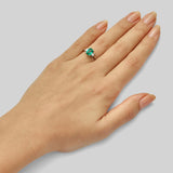 This emerald and diamond engagement ring features an emerald and two emerald-cut diamonds.