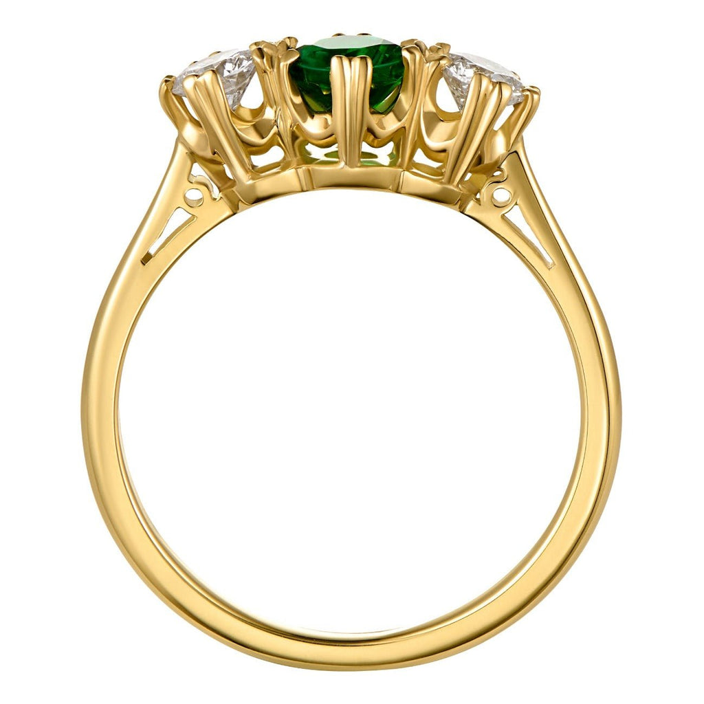 This emerald and diamond trilogy ring features a deep green, vibrant emerald with a round brilliant cut diamond on either side. The three gemstones are set with double claws in an 18ct yellow gold band.