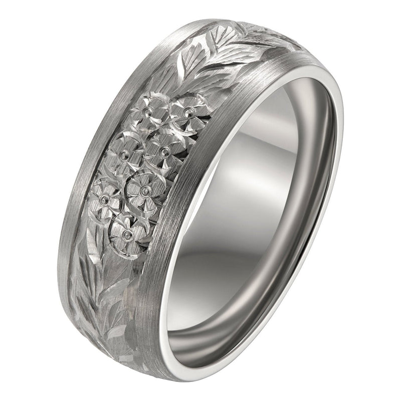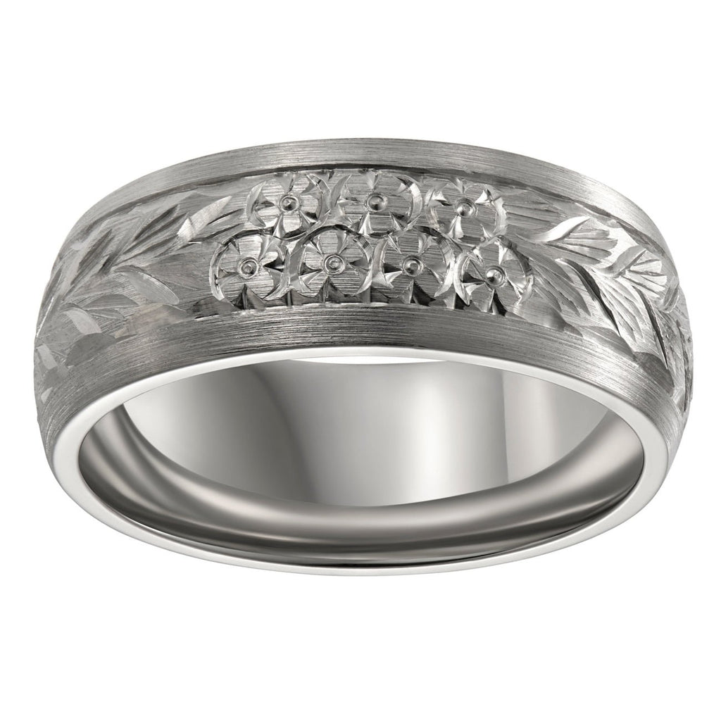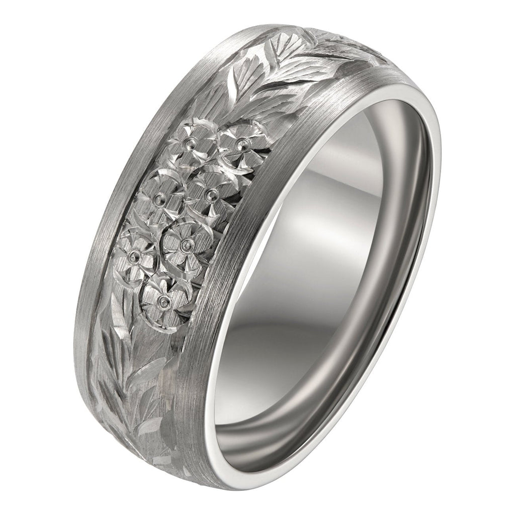 Floral engraved wedding band with court profile