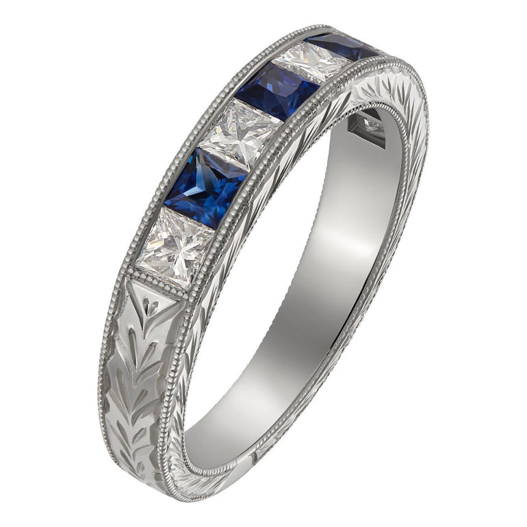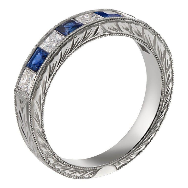 This 4mm wide diamond and sapphire wedding ring features alternating princess-cut gemstones in a rubover setting with a fine millegrain edging. The sapphire and diamond ring is completed with a laurel pattern engraving all the way around the band.