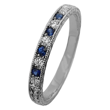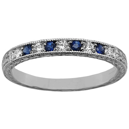 Sapphire and Diamond Wedding Band with Engraved Laurel Pattern