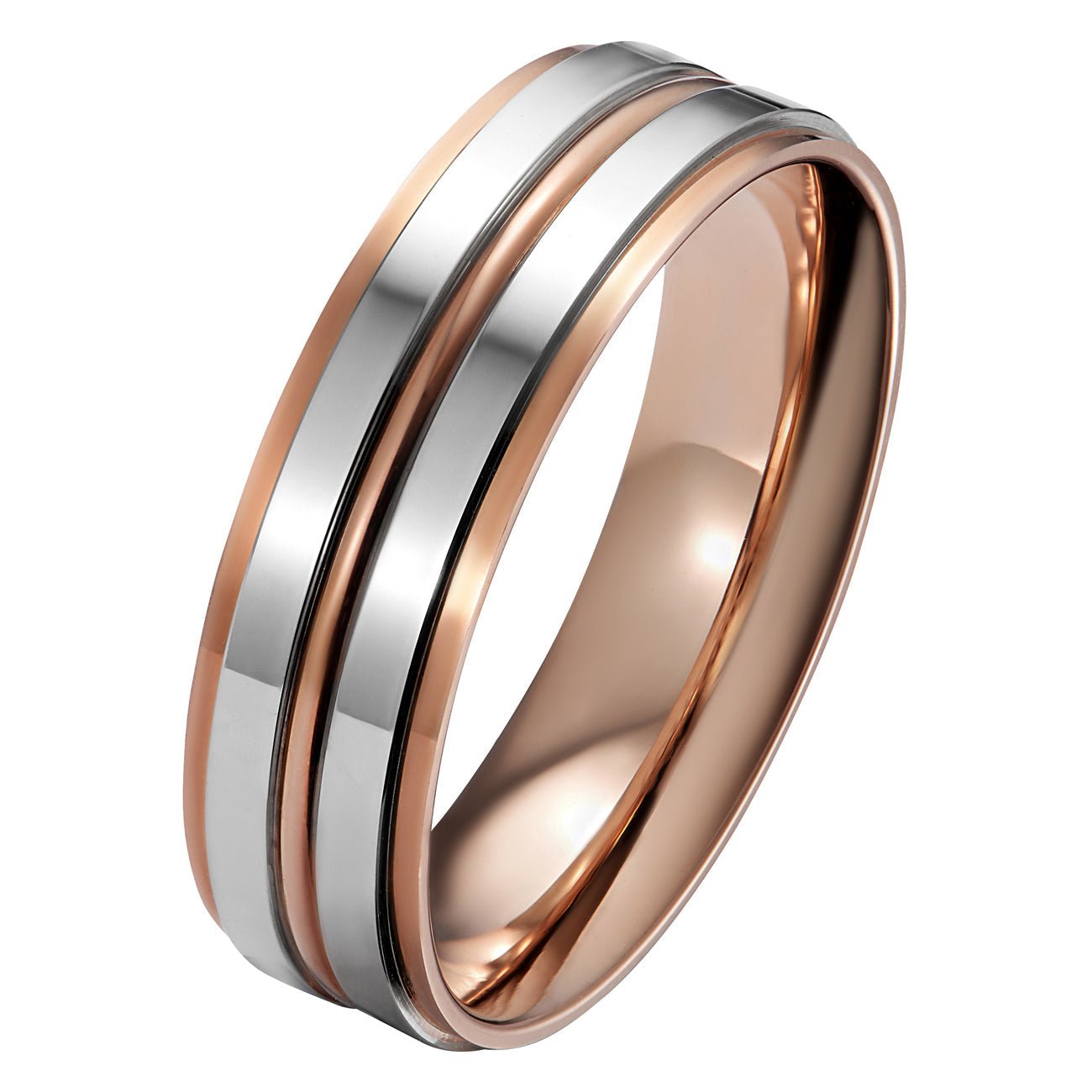 The platinum centre band has a matt finish while the rose gold edges are polished. The edges are chamfered (bevelled) for a bright, modern profile.