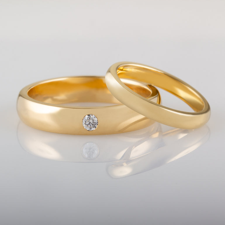 Bride and groom matching wedding ring set in yellow gold