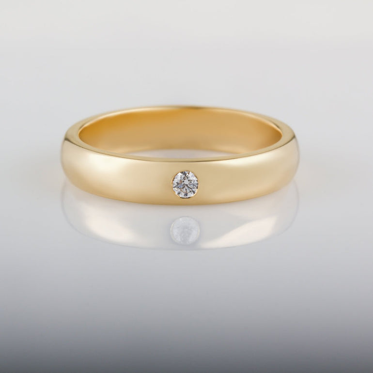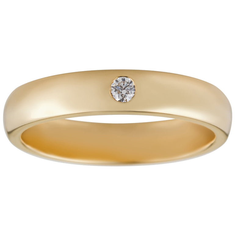 Discover this men's diamond wedding band in 18ct yellow gold. The 0.06 carat round brilliant-cut diamond is set in a 4mm wide band. The ring shown has a polished finish. Please contact us to select a matt finish.