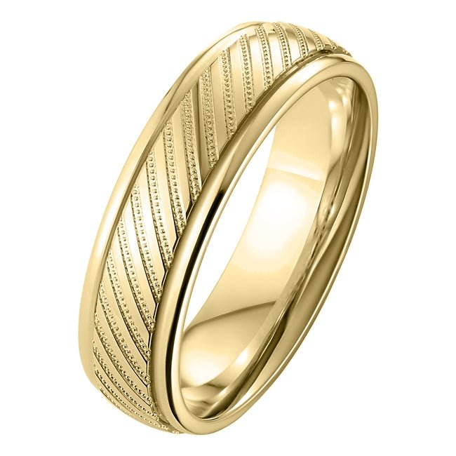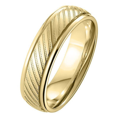 This 6mm yellow gold court shape wedding band features decorative diagonal lines. All ring sizes are available.